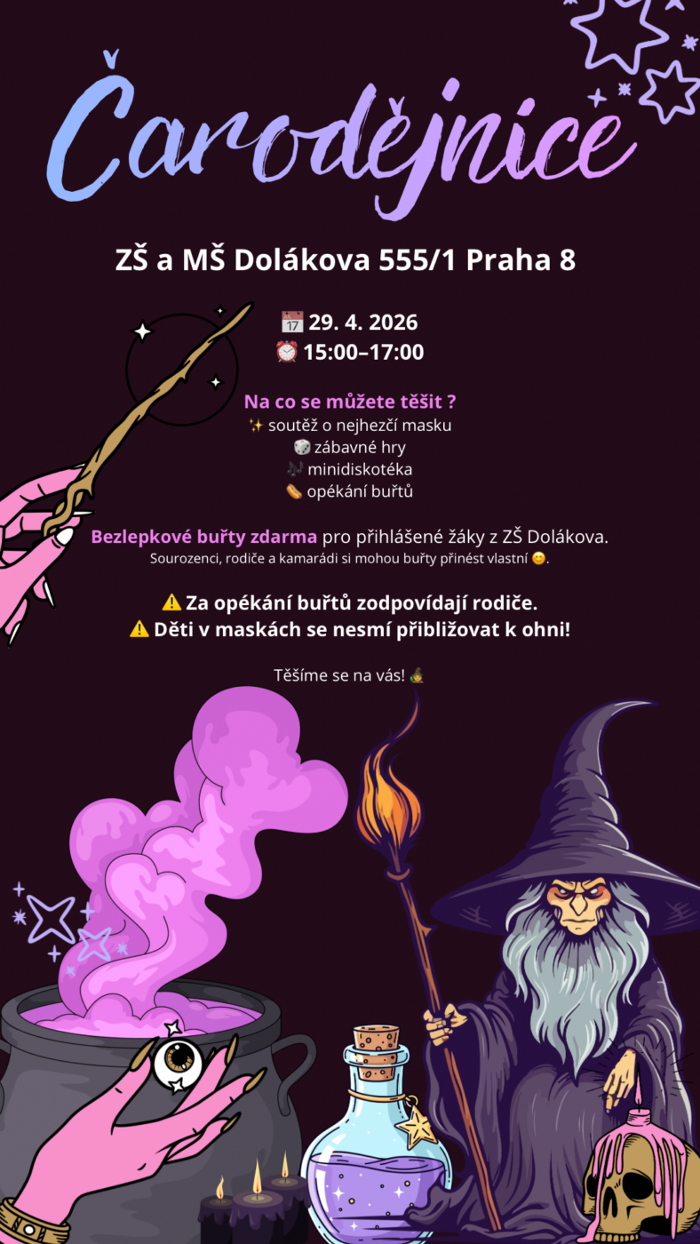 Srdečně vás zveme na čarodějnické odpoledne, které se koná 29. 4. od 15:00 do 17:00 hodin v ZŠ Dolákova. Akce je primárně určena pro první stupeň. Pro přihlášené děti ze ZŠ Dolákova budou připraveny bezlepkové buřty, chybět nebude soutěž o nejhezčí masku, zábavné hry ani tvořivé aktivity. Přijít mohou i rodiče a sourozenci – pokud si však chtějí opéct buřt, je potřeba, aby si přinesli vlastní. Na všechny malé účastníky čekají odměny za splněné úkoly. Těšíme se na vás!