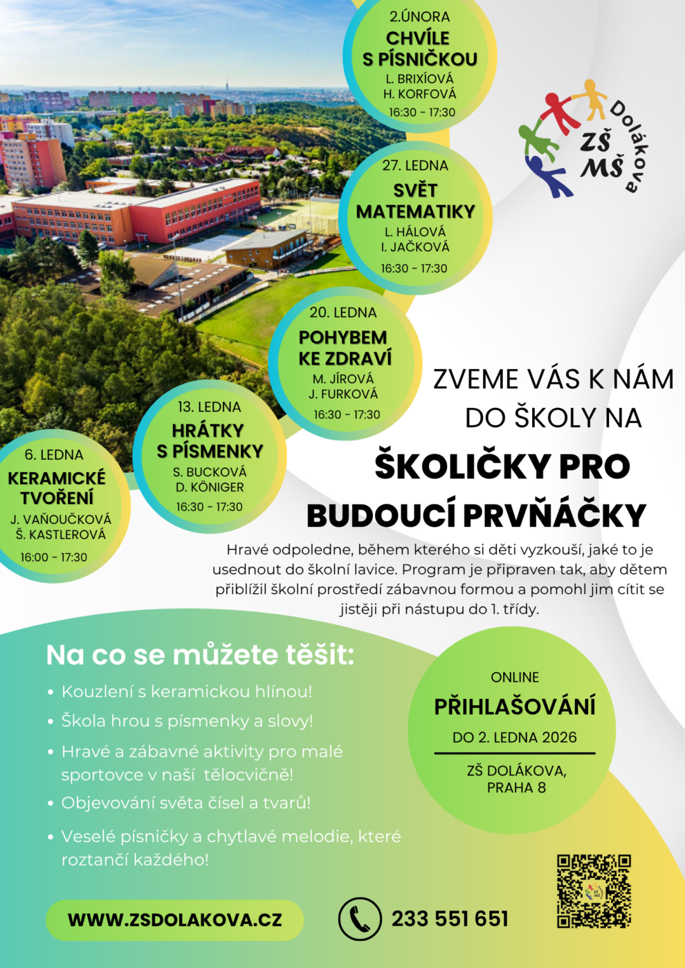 Srdečně zveme všechny předškoláky na tradiční Školičky pro budoucí prvňáčky. Děti si budou moci vyzkoušet roli školáka a seznámí se s našimi učiteli v příjemné a hravé atmosféře. Přihlašování probíhá do 2. ledna prostřednictvím odkazu zde nebo QR kódu uvedeného na letáčku.